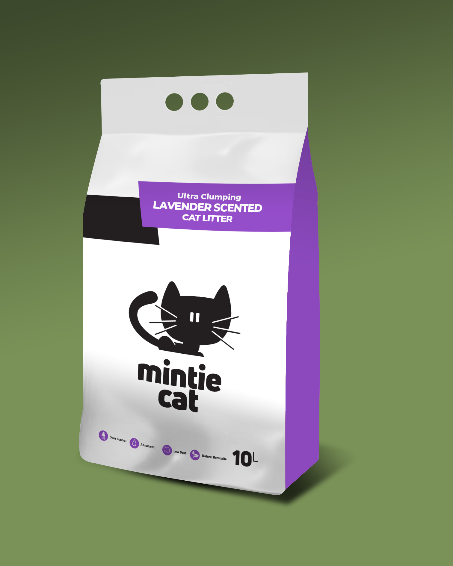 MintieCat™ Lavender Scented Cat Litter is available in 5, 10 and 20 L bags. All packages are user friendly, durable, flat bottom and made from PET + LD PE material.